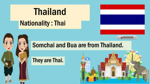 Thailand Nationality : Thai Somchai and Bua are from Thailand. They are Thai.