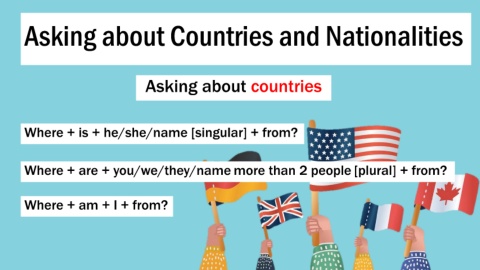 Asking about Countries and Nationalities Asking about countries Where + is + he/she/name [singular] + from? Where + are + you/we/they/name more than 2 people [plural] + from? Where + am + I + from?
