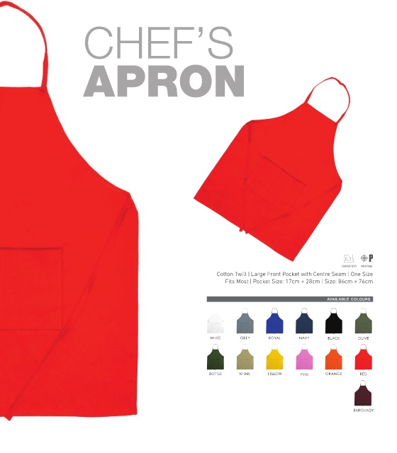 ChEf’s APRON Cotton Twill | Large Front Pocket with Centre Seam | One Size Fits Most | Pocket Size: 17cm × 28cm | Size: 86cm × 76cm available colours WHITE GREY ROYAL NAVY BLACK OLIVE BOTTLE KHAKI YELLOW PINK ORANGE RED BURGUNDY