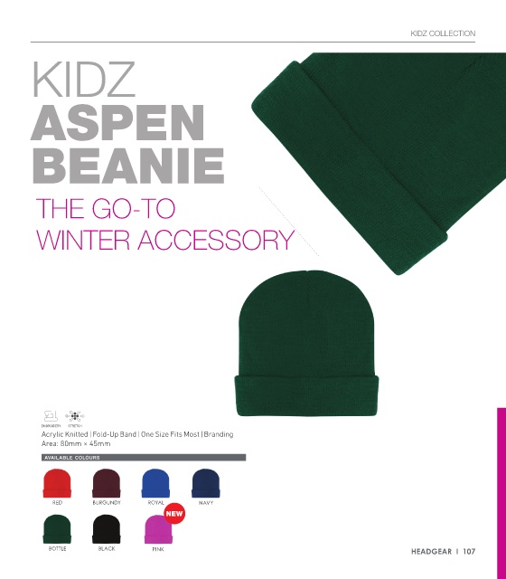 KIDZ CollECTIoN KIDZ ASPEN BEANIE THE GO-TO WINTER ACCESSORY Acrylic Knitted | Fold-Up Band | One Size Fits Most | Branding Area: 80mm × 45mm available colours RED BURGUNDY ROYAL NAVY NEW BOTTLE BLACK PINK HEADGEAR I 107