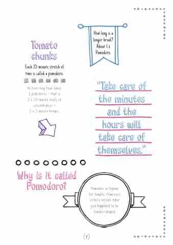 Pomodoro is Italian for tomato Francesco Cirillo’s kitchen timer just happened to be tomato-shaped Tomato chunks Each 25-minute stretch of time is called a a a pomodoro An hour-long task takes 2 pomodoros - that is 2 2 x 25-minute bouts of concentration +