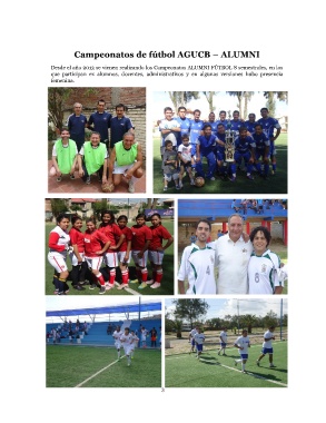 Campeonatos de fútbol AGUCB – ALUMNI Desde el año 2013 se vienen realizando los Campeonatos ALUMNI FÚTBOL 8 semestrales, en los que participan ex alumnos, docentes, administrativos y en algunas versiones hubo presencia femenina. 3
