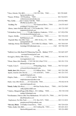 * Race, Glenda ( Mrs Bill) .................... 1383 FM 3266, 75801………. 903-729-8689