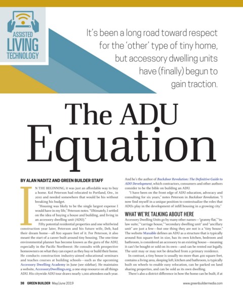 their dream home—all 800 square feet of it. For Peterson, it also The website Maxable denes an ADU as a structure that is typically