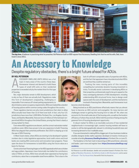 The big time. A believer in practicing what he preaches, Kol Peterson built an 800-square-foot Accessory Dwelling Unit that he and his wife, Deb, have