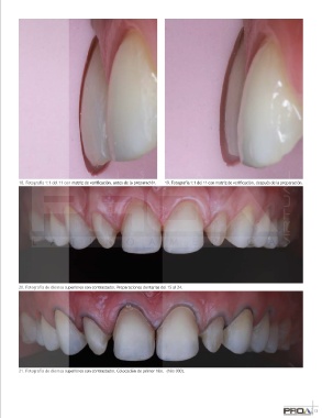 a preparación. 20. Fotografía de dientes superiores con contrastador. Preparaciones dentarias del 15 al 24. 21. Fotografía de dientes superiores con contrastador. Colocación de primer hilo. (hilo 000). 13