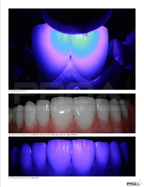 47. Fotopolimerización. 48. Aplicación de glicerina a todas las carillas cementadas para eliminar capa inhibida. 49. Fotopolimerización de la glicerina. 19