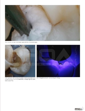 14 A. Secado con papel absorbente para eliminar el exceso de agua. 14 B. Aplicación del bonding (2 capas) a toda la extensión de la 14 C. Fotopolimerización del bonding por 40 seg. cavidad (esmalte y dentina) realizando un masaje vigoroso sobre 9