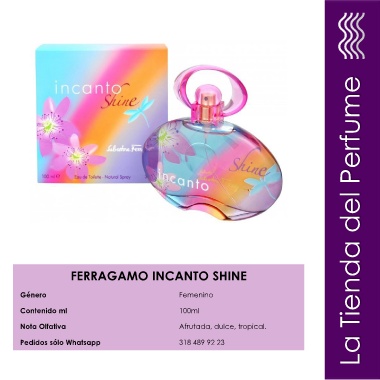 FERRAGAMO INCANTO SHINE La Tienda del Perfume Género Femenino Contenido ml 100ml Nota Olfativa Afrutada, dulce, tropical. Pedidos sólo Whatsapp 318 489 92 23