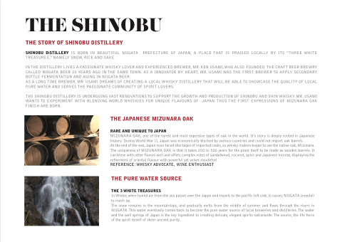 AND AND SHIN SHIN SHIN WHISKY MR USAMI WANTS TO EXPERIMENT WITH BLENDING WORLD WHISKIES FOR UNIQUE FLAVOURS OF OF JAPAN THUS THE FIRST EXPRESSIONS OF OF MIZUNARA OAK FINISH ARE BORN THE JAPANESE MIZUNARA OAK RARE AND UNIQUE TO JAPAN MIZUNARA OAK one of of the the rarest and most expensive types of of oak in in the the world It’s story is deeply rooted in in Japanase history During World War II Japan was economically blocked by various countries and could not import oak barrels At the the the end of of the the the war Japan soon faced shortages of of imported casks so so whisky makers began to use the the the native oak Mizunara The uniqueness of MIZUNARA OAK is that it it takes 200 to to 500 years for the plant itself to to be made as wooden barrels It can blene with other flavors well and and and offers complex notes of of sandalwood coconut spice and and and Japanese incense displaying the the refinement of oriental flavour with powerful yet velvet mouthfeel REFERENCE: WHISKY ADVOCATE WINE ENTHUSIAST