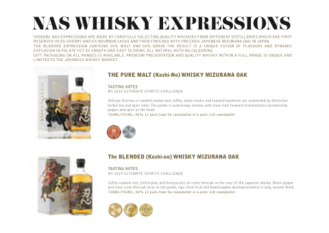 ARE ARE ARE MADE BY CAREFULLY SELECTING QUALITY WHISKIES FROM DIFFERENT DISTILLERIES WHICH ARE ARE ARE FIRST RESERVED IN IN IN EX-SHERRY AND AND EX-BOURBON CASKS AND AND THEN FINISHED WITH PRECIOUS JAPANESE MIZUNARA OAK IN IN IN JAPAN JAPAN THE THE BLENDED EXPRESSION CONTAINS 50% 50% MALT AND AND 50% 50% GRAIN THE THE RESULT IS A A A A A A A A UNIQUE FUSION OF FLAVOURS AND AND DYNAMIC EXPLOSION IN IN IN PALATE YET SO SMOOTH AND EASY TO DRINK ALL NATURAL WITH NO COLOURING GIFT PACKAGING ON ON ALL RANGES IS IS IS AVAILABLE PREMIUM PRESENTATION AND AND QUALITY WHISKY WITHIN A A A A A A A A A A A A A FULL RANGE RANGE IS IS IS UNIQUE AND AND LIMITED TO THE JAPANESE WHISKY MARKET THE PURE MALT (Koshi-No) WHISKY MIZURANA OAK TASTING NOTES