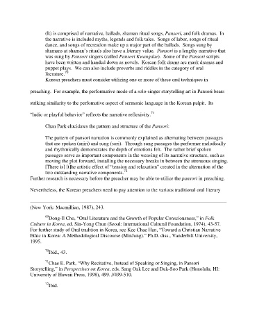 preaching. For example, the performative mode of a solo-singer storytelling art in Pansori bears