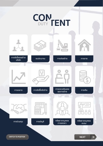 DUTY การจัดโครงสร้าง งบประมาณ การก่อสร้าง การขาย บริษัท การตรวจรับของ การตลาด การจัดซื้อจัดจ้าง การเงิน และการจ้าง ทรัพยากรบุคคล ทรัพยากรบุคคล การร่วมทุน การบัญชี การสรรหา อบรม NEXT