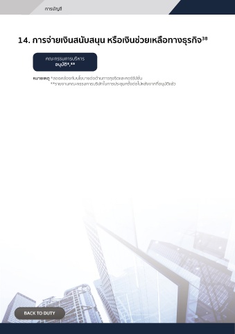 การบัญชี 14. การจ่ายเงินสนับสนุน หรือเงินช่วยเหลือทางธุรกิจ 38 คณะกรรมการบริหาร อนุมัติ*,** หมายเหตุ *สอดคล้องกับนโยบายต่อต้านการทุจริตและคอร์รัปชั่น **รายงานคณะกรรมการบริษัทในการประชุมครั้งต่อไปหลังจากที่อนุมัติแล้ว