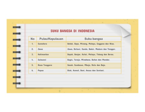 Suku Batak, Gayo, Minang, Melayu, Enggano Jawa, Betawi, Sunda, Badui, Madura dan Tengger. Dayak, Banjar, Kutai, Melayu, Tidung Sasak, Sumbawa, Mbojo, Rote dan Bajo.
