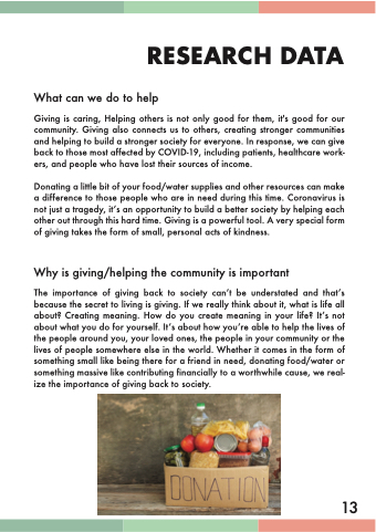 Giving is caring, Helping others is not only good for them, it's good for our community. Giving also connects us to others, creating stronger communities and helping to build a stronger society for everyone. In response, we can give back to those most affected by COVID-19, including patients, healthcare work- ers, and people who have lost their sources of income.