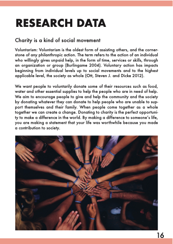 We want people to voluntarily donate some of their resources such as food, water and other essential supplies to help the people who are in need of help. We aim to encourage people to give and help the community and the society by donating whatever they can donate to help people who are unable to sup- port themselves and their family. When people come together as a whole together we can create a change. Donating to charity is the perfect opportuni- ty to make a difference in the world. By making a difference to someoneʼs life, you are making a statement that your life was worthwhile because you made a contribution to society.