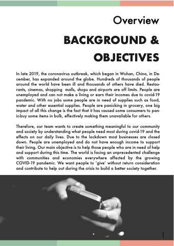 Therefore, our team wants to create something meaningful to our community and society by understanding what people need most during covid-19 and the effects on our daily lives. Due to the lockdown most businesses are closed down. People are unemployed and do not have enough income to support their living. Our main objective is to help those people who are in need of help and support during this time. The world is facing an unprecedented challenge with communities and economies everywhere affected by the growing COVID-19 pandemic. We want people to ʻgiveʼ without return consideration and contribute to help out during the crisis to build a better society together.