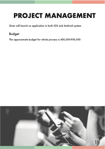 PROJECT MANAGEMENT Giver will launch as application in both IOS and Android system. Budget The approximate budget for whole process is 400,000-900,000 11