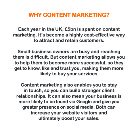 Small-business owners are busy and reaching them is difficult. But content marketing allows you to help them to become more successful, so they get to know, like and trust you, making them more likely to buy your services.