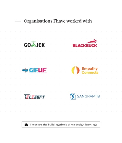 Organisations I’have worked with Empathy Connects SANGRAM’18 These are the building pixels of my design learnings