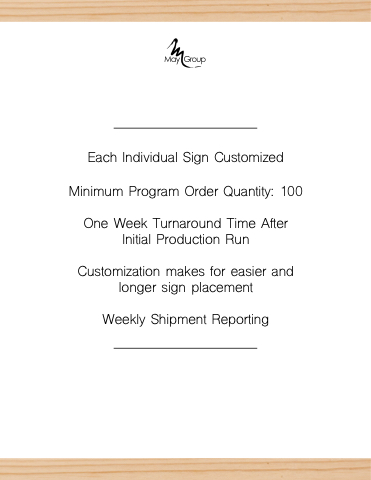 Each Individual Sign Customized Minimum Program Order Quantity: 100 One Week Turnaround Time After Initial Production Run Customization makes for easier and longer sign placement Weekly Shipment Reporting