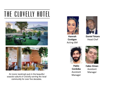 Hannah Daniel Totaro Costigan Head Chef Acting GM Pablo Fabio Oman Cordoba Assistant Assistant Manager An iconic landmark pub in the beautiful Manager seaside suburb of Clovelly serving the local community for over five decades.