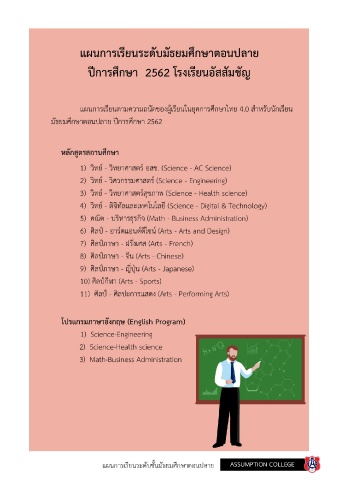 รายละเอียดของแผนการเรียน ปีการศึกษา 2562 โรงเรียนอัสสัมชัญ