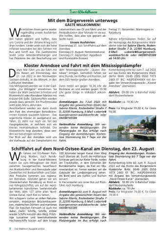 Kostenbeitrag bitte bis zum 9. August 2022 auf das Konto des Bürgervereins Walddörfer IBAN: DE49 2005 0550 1073 2443 01 BIC: HASPDEHHXXX mit Angabe des Verwendungszwecks „Nord-Ostsee-Kanal“ überweisen. Abfahrt: 10:30 Uhr U-Bahnhof Volks- dorf/ Rockenhofseite