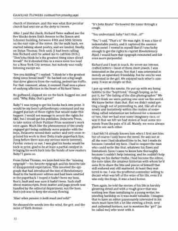 From Dylan Thomas, we launched into the “missing epigraph”—his favorite epigraph and his favorite tale of disappointed expectation. This involved the epi- graph that had introduced the text of Revolutionary Road in the hardcover edition and had been omitted in the paperback. I hoped it hadn’t been my boss, Ron’s, fault and was sure it hadn’t been. Such stuff about manuscripts, front matter and page proofs was handled by the editorial department, not the boss. Ron’s job was to keep the money flowing.