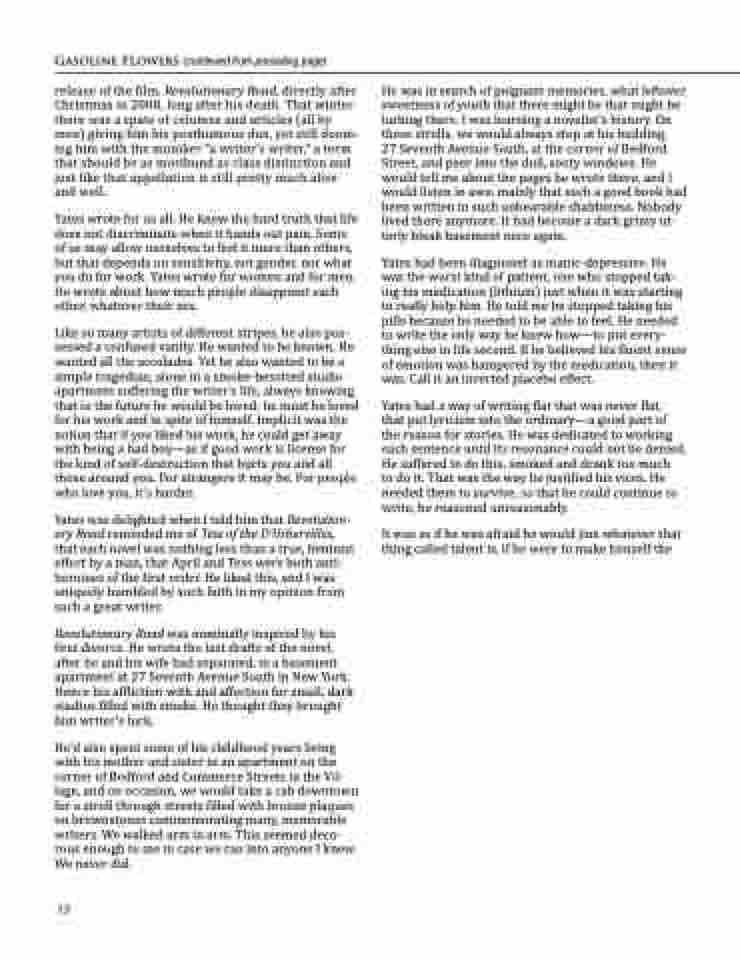 release of the film, Revolutionary Road, directly after Christmas in 2008, long after his death. That winter there was a spate of columns and articles (all by men) giving him his posthumous due, yet still doom- ing him with the moniker “a writer’s writer,” a term that should be as moribund as class distinction and just like that appellation is still pretty much alive and well.