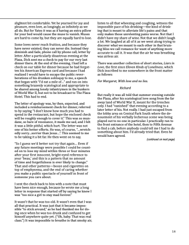 Some loves never reach fruition, and because they have never existed, they can never die. Instead they diminish and fade, phone call by phone call, letter by letter. After a particularly disastrous evening at the Plaza, Dick sent me a check to pay for our very last dinner there. At the end of the evening, I had left a check on our table for dinner because he had forgot- ten his American Express card and because I had realized I would have to escape the public rever- berations of his drunken soliloquy to me, a speech that began with “I’d eat a mile of...” and ran on into something brazenly scatological and appropriate to be shared among lonely infantrymen in the bunkers of World War II, but not to be broadcast to The Plaza Hotel. This had to end.