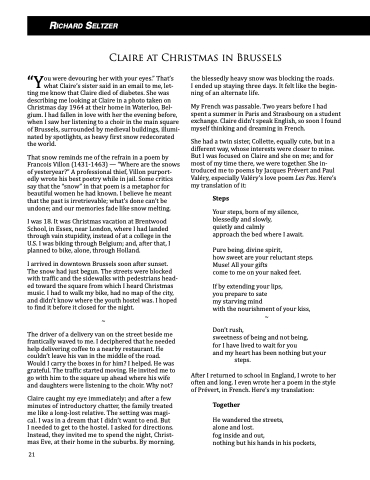 ting me know that Claire died of diabetes. She was describing me looking at Claire in a photo taken on Christmas day 1964 at their home in Waterloo, Bel- gium. I had fallen in love with her the evening before, when I saw her listening to a choir in the main square of Brussels, surrounded by medieval buildings, illumi- nated by spotlights, as heavy first snow redecorated the world.