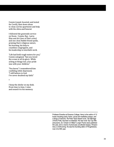 a trilogy of memoirs. His Peter Taylor Award novel, The Marriage of Anna Potts, has been re-released. His new novel Top Cop Kills and poems, Do I Dream Or Wake? Longer Poems were published this year, and a volume of previously uncollected essays, Perspec- tives, is forthcoming. He was the founding editor of Ploughshares, now in its 54th year.
