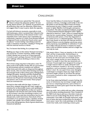 and becomes its soul,/ A light in sound, a sound-like power in light/ Rhythm in all thought, and joyance everywhere. The often mocked but brilliant, prophet- ic Transcendental feminist Margaret Fuller rightly objected to America’s “male” vision of conquering the land, but her countervailing “feminine” ideal insisted on harmony with nature, a view that depended on her notion of it as “a cultivated garden.” This morn- ing, it was clearer to me than ever that the world of capital-N Nature scarcely displays synchrony, synes- thesia, harmony, susceptibility to cultivation. It can’t be so tidily reduced, because it contains too many tales, in fact an infinite number, and not a single one can truly be read.