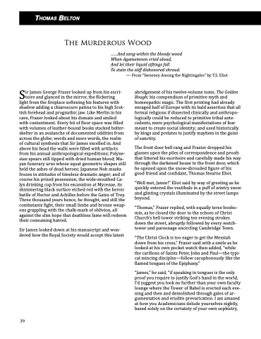 The front door bell rang and Frazier dropped his glasses upon the piles of correspondence and proofs that littered his escritoire and carefully made his way through the darkened house to the front door, which he opened upon the snow-shrouded figure of his good friend and confidant, Thomas Stearns Eliot.