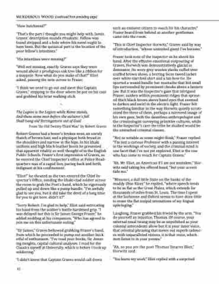“Sir James,” Graves bellowed grabbing Frazer’s hand, from which he proceeded to pump out another buck- etful of enthusiasm. “I’ve read your books, Sir. Amaz- ing insights, capital cultural analyses. I read for the Classics myself at University, which is before I took up soldiering.”