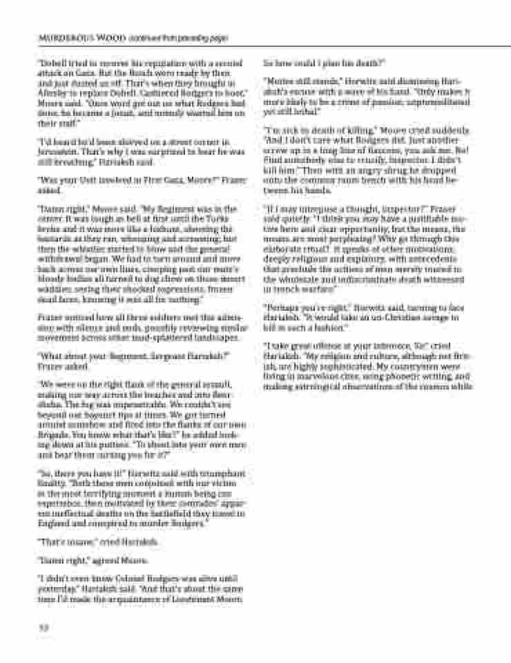 “If I may interpose a thought, Inspector?” Frazer said quietly. “I think you may have a justifiable mo- tive here and clear opportunity, but the means, the means are most perplexing? Why go through this elaborate ritual? It speaks of other motivations; deeply religious and expiatory, with antecedents that preclude the actions of men merely inured to the wholesale and indiscriminate death witnessed in trench warfare.”