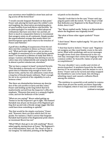 “Exactly! I took that to be the case,” Frazer said, tap- ping his patch with the twitch. “It’s the ‘Heart of Oak’ that dedicates your Regiment to the Royal Forest at Arden, does it not?”