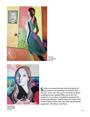 Schlam is an award-winning artist and author of four books on art including The Creative Path The Zen of Art; and The Joy of Art Series of Books including the just released More Joy of Art. Her artwork is in a number of collections including The Smithsonian Museum. Carolyn lives and works in the Hudson Valley of New York. Her work has previously appeared in The Woven Tale Press.