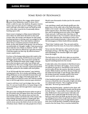 Dawn is just creeping in a filmy mauve behind the trees when we rattle down the drive in the Land Cruiser. Jabu, the tracker and skinner for this small hunting operation is driving, and I am wedged in the backseat listening to Terry and Andreis reminisce about Terry’s seventeen previous South African hunts. As the only female of the group, I do not feel as uncomfortable as I thought I might. I took my practice shots with the rest of them on Andreis’ .30-06 —held my own. But when he offered me a gun this morning, I told him maybe not this trip. By which he knew I meant, maybe never.