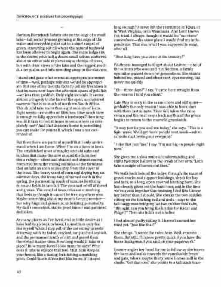 I stand and gaze what seems an appropriate amount of time—well, perhaps minutes would be appropri- ate. But one of my favorite facts to tell my freshmen is that humans now have the attention spans of goldfish —or less than goldfish. Only eight seconds. It seems almost a tragedy in the face of the open, uncluttered rawness that is so much of northern South Africa. This should take more than eight seconds of focus. Eight weeks or months or lifetimes. How much time is enough to fully appreciate a landscape? How long would it take to feel at home in somewhere so com- pletely new? And that assumes home is something you can make for yourself, which I was once con- vinced of.