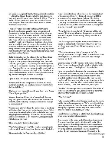 ket appaloosa, spindly tail twitching at the horseflies —which I had been disappointed to find also preva- lent, and possibly even larger in South Africa. “That’s Radar. She’s a guide and guest horse. Don’t let the ears fool you.” She slips me a small piece of carrot. “Bribes usually work.”