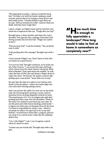 And I can picture the sable I’ve seen out on the bush- veld, the towering black antelope cousin, with its immense horns arching elegantly towards its back. The massiveness of it. I try to imagine the split skin pealing back like a mat over the shoulders. Think of the times I’ve wished to peel back my own skin. To see the pink and white fascia banding underneath— to figure out what piece of shrapnel from all the lives I’ve lived is responsible for where I am—which is certainly not where I’d expected to be in my mid- thirties. I would hunt it down like a surgeon, pluck it out, drop it in a sterile bowl. Clink. My life suddenly debris free.