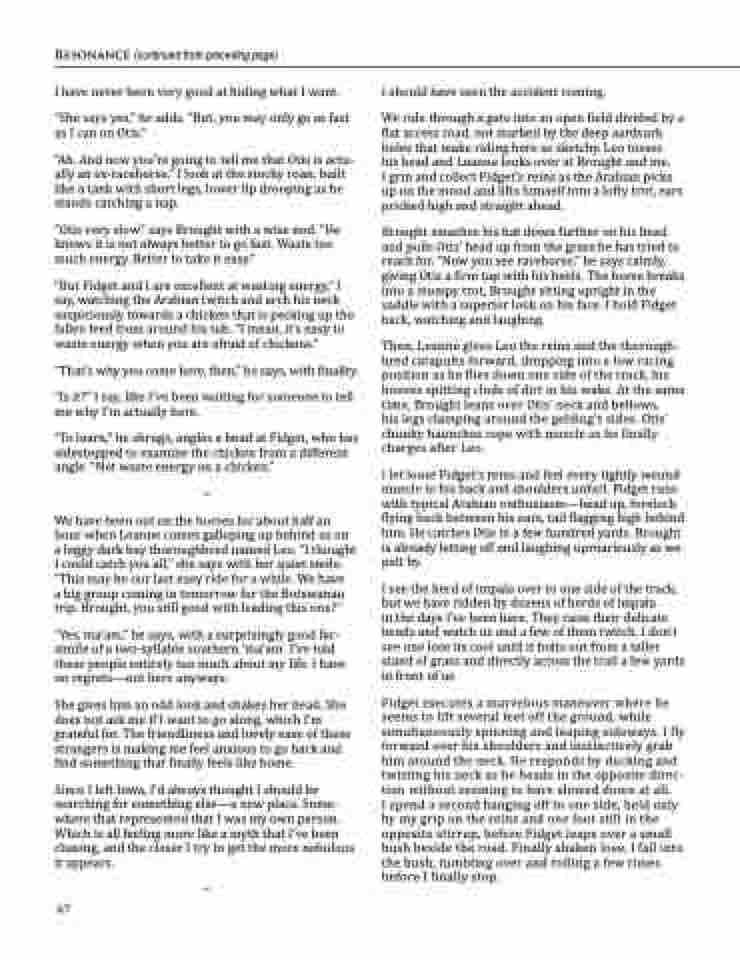 I let loose Fidget’s reins and feel every tightly wound muscle in his back and shoulders unfurl. Fidget runs with typical Arabian enthusiasm—head up, forelock flying back between his ears, tail flagging high behind him. He catches Otis in a few hundred yards. Brought is already letting off and laughing uproariously as we pelt by.