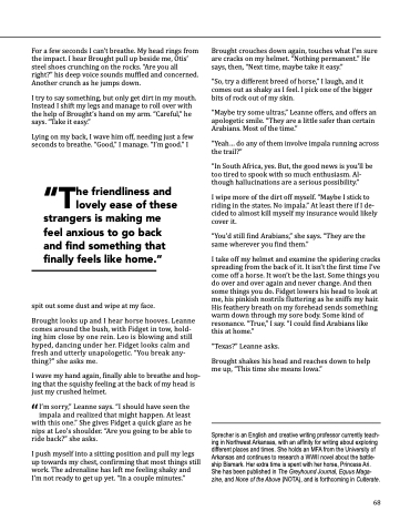 I take off my helmet and examine the spidering cracks spreading from the back of it. It isn’t the first time I’ve come off a horse. It won’t be the last. Some things you do over and over again and never change. And then some things you do. Fidget lowers his head to look at me, his pinkish nostrils fluttering as he sniffs my hair. His feathery breath on my forehead sends something warm down through my sore body. Some kind of resonance. “True,” I say. “I could find Arabians like this at home.”