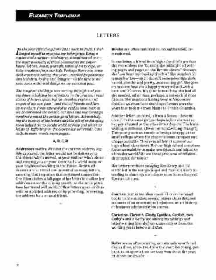 In the year stretching from 2021 back to 2020, I chal- lenged myself to organize my belongings. Being a reader and a writer—and worse, a sentimental one— the most unwieldly of those possessions are paper- based: letters, books, journals, notes of every type, ar- tistic creations from our kids. Perhaps there was some deliberation in setting this year—marked by pandemic and isolation, by fire and drought—as the time to im- pose some order and design on my personal past.