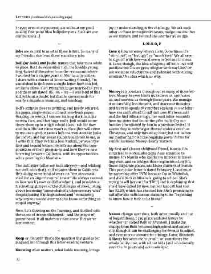 Jodi’s script is close to printing, and neatly squared; his pages, single-sided on lined note-book paper. Reading his words, I can see his long dark hair, his narrow face, and that huge smile. Jodi would some- times show up in a high school class I sub for now and then. His last name won’t surface (but will come to me one night). It seems he’s married another Jodie (or Jode?), and her sweet round face comes to me, as I write this. They’ve had a boy, Nathan, between the first and second letters. He tells me about the com- plications of their pregnancy, and how they’re now hovering between California, with its opportunities, while yearning for Montana.