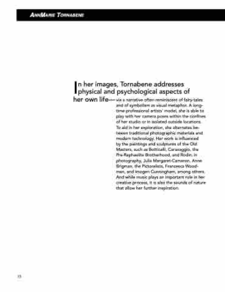 and of symbolism as visual metaphor. A long- time professional artists’ model, she is able to play with her camera poses within the confines of her studio or in isolated outside locations. To aid in her exploration, she alternates be- tween traditional photographic materials and modern technology. Her work is influenced