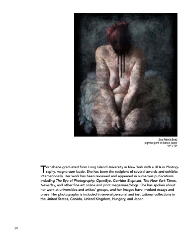 Tornabene graduated from Long Island University in New York with a BFA in Photog- raphy, magna cum laude. She has been the recipient of several awards and exhibits internationally. Her work has been reviewed and appeared in numerous publications including The Eye of Photography, OpenEye, Corridor Elephant, The New York Times, Newsday, and other fine art online and print magazines/blogs. She has spoken about her work at universities and artists’ groups, and her images have invoked essays and prose. Her photography is included in several personal and institutional collections in the United States, Canada, United Kingdom, Hungary, and Japan.